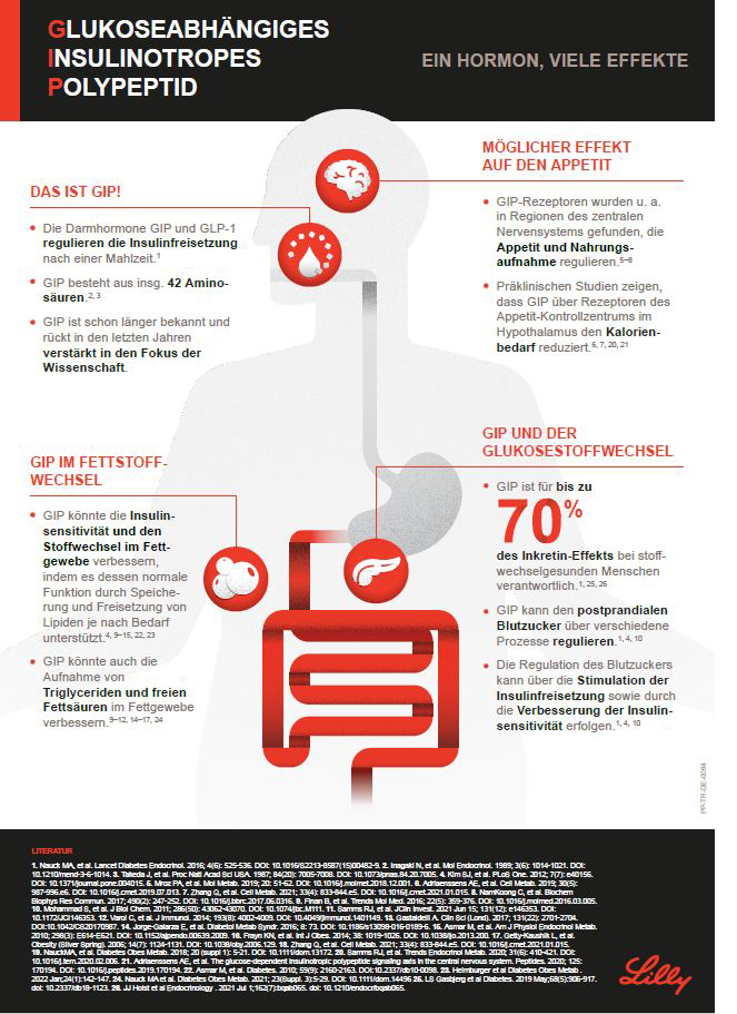 Ob und inwiefern GIP über Rezeptoren des Appetit-Kontrollzentrums im Hypothalamus den Kalorienbedarf reduzieren kann, dazu finden sich Hinweise in präklinischen Studien [22-25].