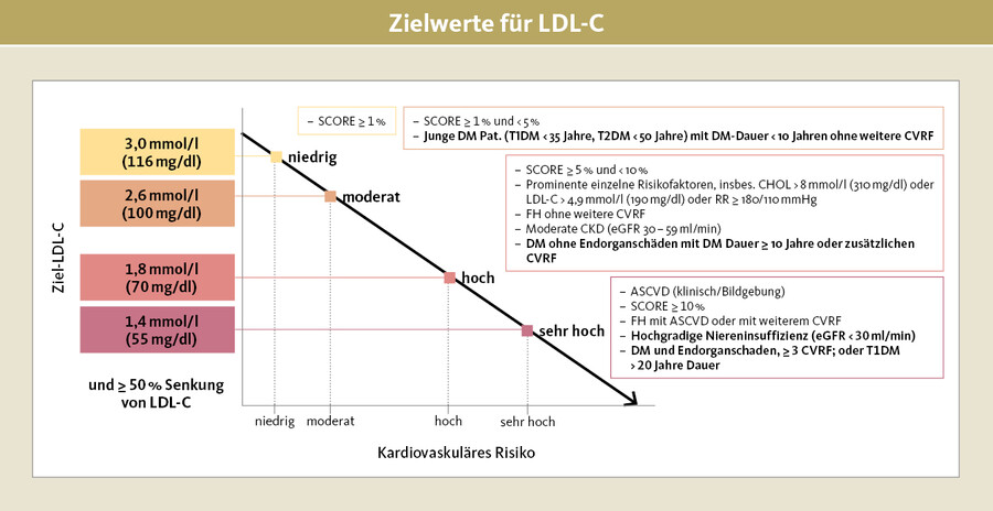 Daten aus epidemiologischen, genetischen, tierexperimentellen und klinisch-interventionellen Studien unterstreichen die Bedeutung des LDL-C als Risikofaktor und identifizierten es als Haupt-Driver für Atherosklerose. Der absolute Effekt einer Senkung des LDL-C hängt ab vom individuellen kardiovaskulären Absolutrisiko, dem Ausgangswert des LDL-C, dem Ausmaß und der Dauer der LDL-Senkung. Durchschnittlich kann man bei einer LDL-C-Senkung um 40 mg/dl (1 mmol/l) eine Reduktion des relativen atherosklerotisch-kardiovaskulären Risikos um 24 % erwarten.
