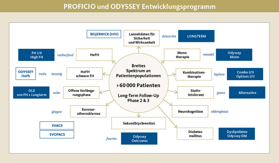 Über die Meilenstein-Studien mit diesen Substanzen haben wir in DCR wiederholt berichtet [7 – 9]. Wie umfangreich die noch laufenden klinischen Studienprogramme, PROFICIO Program für Evolocumab respektive ODYSSEY Program für Alirocumab, sind, hat Frau Dr. Schatz in einer ihrer Vortragsfolien zusammengefasst (Abb. 2).
