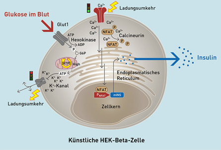 In den künstlichen Beta-Zellen befördert das natürliche Glukose-Transportprotein der HEK-Zellen Glukose aus dem Blut ins Zellinnere. Sobald der Blutzuckerspiegel eine gewisse Schwelle überschreitet, schließen sich die Kalium-Kanäle. Dadurch kippt die Spannungsverteilung an der Membran, die Kalzium-Kanäle öffnen sich und das einströmende Kalzium löst eine in die HEK-Zellen eingebaute Signalkaskade aus an deren Ende die Produktion und Ausschüttung von Insulin beziehungsweise GLP1 stehen.