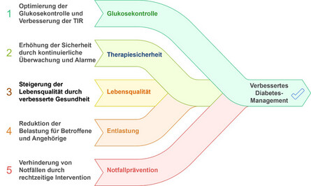 - CGM trägt zur Verbesserung der Glukosekontrolle (HbA1c, TIR, Erhöhung der Therapiesicherheit und Steigerung der Lebensqualität bei.