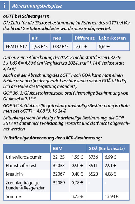 Im Rahmen der geänderten Vergütung von Laborleistungen ist es wichtig, darauf zu achten, dass die Abrechnung aller erbrachten Leistungen vollständig erfolgt und dass die richtigen Laborziffern ausgewählt werden. Es sollte z. B. immer geprüft werden, ob die alleinige Bestimmung des HbA1c ausreicht, oder ob zusätzlich nicht auch eine Messung der Plasmaglukose sinnvoll ist. Auch bei der Bestimmung der uACR und beim oGTT im Rahmen der Schwangerenbetreuung gibt es Fallstricke zu beachten (Abrechnungsbeispiele).