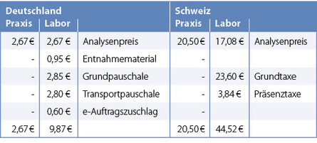 Im Vergleich: Kolleginnen und Kollegen in Österreich erhalten für die gleiche Bestimmung mehr als das 4-fache, die in der Schweiz fast das 8-fache! (Tab. 1) Ein Vergleich mit der Schweiz zeigt auch, dass die Bestimmung von Laborparametern im Präsenzlabor für den Kostenträger günstiger ist, allerdings ist die Differenz geringer. Eine Bestimmung im Großlabor ist etwa um den Faktor 3,5 teurer als in der Praxis, in der Schweiz immer noch gut um das Doppelte. Dazu kommen ein umweltschädlicher Transport und, je nach Parameter, eine zeitabhängige Beeinträchtigung der Analysenergebnisse (Tab. 2).