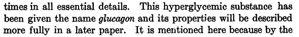 Prof. John Raymund Murlin am Institut für Physiologie der Universität in Rochester in den USA konnte 1923 die Wirkung des Glucagon nachweisen und gab ihm auch seinen Namen. Murlin hatte sich bereits vor 1916 mit Pankreasextrakten beschäftigt. Aber dann musste er zur Armee, denn die USA war auf Seiten der Alliierten in den ersten Weltkrieg eingetreten. Er hätte wahrscheinlich schon vor Banting und Best ein brauchbares Insulinpräparat gewonnen – aber wie im Fall von Scott, Zülzer und Paulescu verhinderte der Krieg weitere Arbeit an diesem Thema. Nach 1918 nahm Murlin mit seiner Arbeitsgruppe die Insulinforschung wieder auf und es gelang ihm sogar im Mai 1922, einen Fall von diabetischem Koma erfolgreich zu behandeln. In der US-Presse fand dies ein breites Echo. Aber in Toronto hatte man bereits im Januar desselben Jahres brauchbares Insulin hergestellt und somit verpasste Prof. Murlin nur um wenige Monate den Nobelpreis. Bei der Untersuchung der Stoffwechselwirkungen seiner Extrakte aus Bauchspeicheldrüsen fiel ihm auf, dass es nach der Injektion zu einer kurzfristigen Erhöhung des Blutzuckerspiegels kam, erst danach wirkte das in den Präparaten enthaltene Insulin und der Blutzucker fiel ab. Murlin wurde klar, dass in dem Extrakt aus Bauchspeicheldrüsen neben Insulin auch eine weitere Substanz enthalten sein musste. Er nannte diese Substanz Glucagon – abgeleitet von Glu(cose)agon(ist). Es gelang ihm aber nicht, Glucagon weiter zu reinigen und Murlin wandte sich anderen Themen zu. Er wurde ein bedeutender Ernährungsforscher und starb 1960 hochgeehrt im Alter von 86 Jahren – die Entdecker des Insulins hat er um viele Jahrzehnte überlebt.