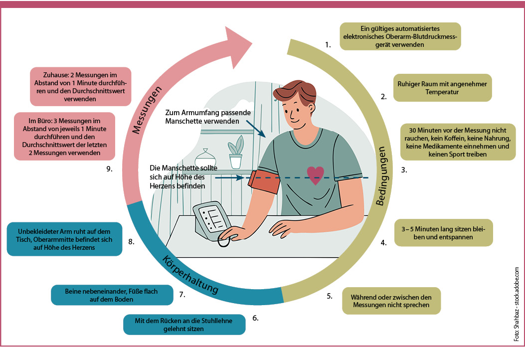 Abb. 1: Empfehlungen der European Society of Hypertension ESH 2023 zur Messung des Blutdrucks [nach ESH Guidelines for the management of arterial hypertension 2023].