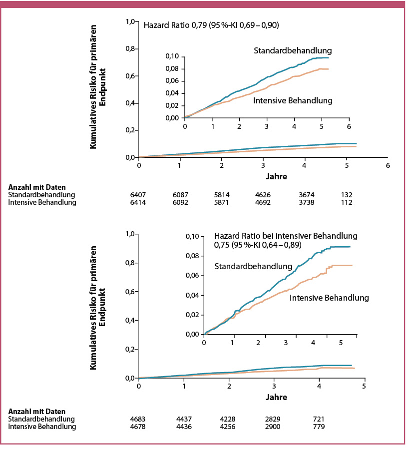 Nach einem Jahr lag der mittlere systolische Blutdruck im intensivierten Behandlungsarm bei 121,6 mmHg (Median 118,3 mmHg), und im standardmäßigen Behandlungsarm bei 133,2 mmHg (Median 135,0 mmHg). Während des mittleren Follow-up von 4,2 Jahren traten bei 393 Patienten im intensivierten Behandlungsarm primäre Endpunktereignisse auf (1,65 Ereignisse pro 100 Personenjahre), und bei 492 Patienten im standardmäßigen Behandlungsarm (2,09 Ereignisse pro 100 Personenjahre) (Abbildung 3; Hazard Ratio 0,79; 95 %-Konfidenzintervall 0,69 – 0,90; p < 0,001). Wiewohl die Inzidenz ernsthafter Nebenwirkungen in beiden Gruppen gleich war, traten symptomatische Hypotonie und Hyperkaliämie häufiger im intensivierten Behandlungsarm auf.