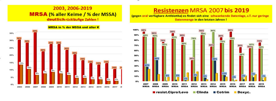 Im Verlauf der Jahre sehen wir einen deutlichen, kontinuierlichen Rückgang der MRSA-Fälle (Abbildung 5). Die Resistenzlage bei MRSA hat sich zuletzt leicht zum günstigeren verändert, weiterhin oral gut verfügbar sind Cotrim und Doxycyclin.
