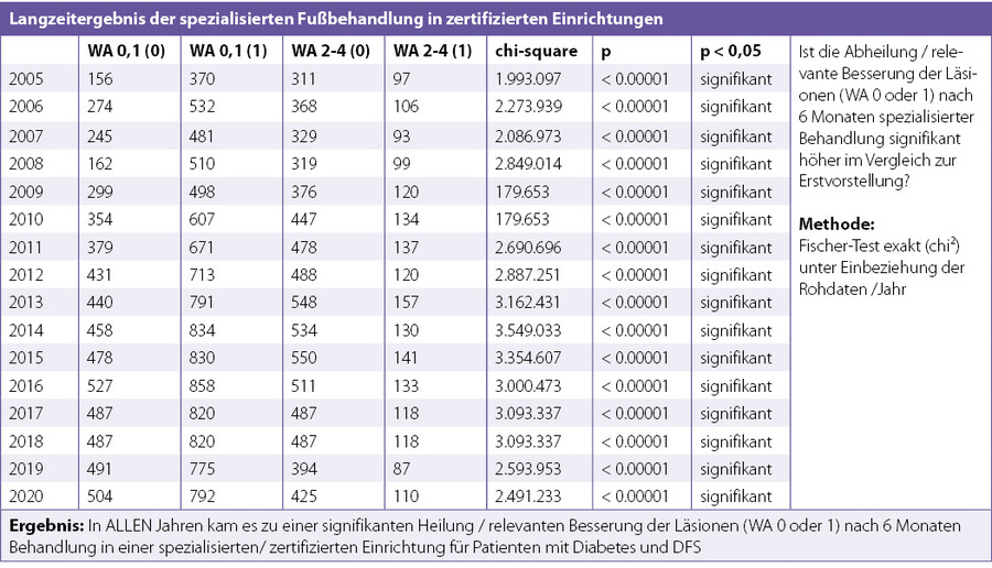 Von 2005 bis 2020 wurden von mittlerweile 36 Ärzten in 28 zertifizierten Fußbehandlungseinrichtungen insgesamt 14.020 Fälle dokumentiert. Die Kontrolluntersuchungen nach 6 Monaten ergaben eine signifikante Heilung/relevante Besserung der Läsionen).