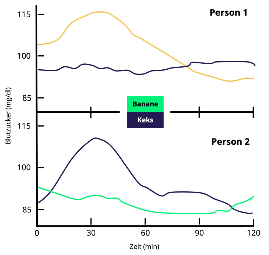 Die Autoren deuten darauf hin, dass universelle Ernährungsempfehlungen einen begrenzten Nutzen haben. Stattdessen konnte der von den Autoren entwickelte, auf künstlicher Intelligenz beruhender Algorithmus mittels Beizug zusätzlicher variablen wie Blutparameter, Ernährungsgewohnheiten, anthropometrischen Daten, körperlicher Aktivität und dem Mikrobiom die individuellen postprandialen Blutzuckerverläufe zuverlässig vorhersagen (Abb. 1).