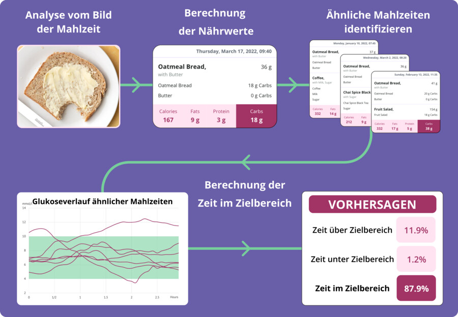 Den Blutzucker rund um Mahlzeiten regelmäßig im Zielbereich zu halten, ist für viele Menschen mit Diabetes eine große Herausforderung. Nicht nur die Bestimmung der Nährwerte einer Mahlzeit verursacht Unsicherheiten, sondern auch die Quantifizierung von zusätzlichen potentiellen Einflussfaktoren wie Bewegung, Schlaf, Tageszeit und Zyklus. Ist eine stärker personalisierte, datenbasierte Therapieunterstützung zur postprandialen Blutzucker Kontrolle sinnvoll und umsetzbar?