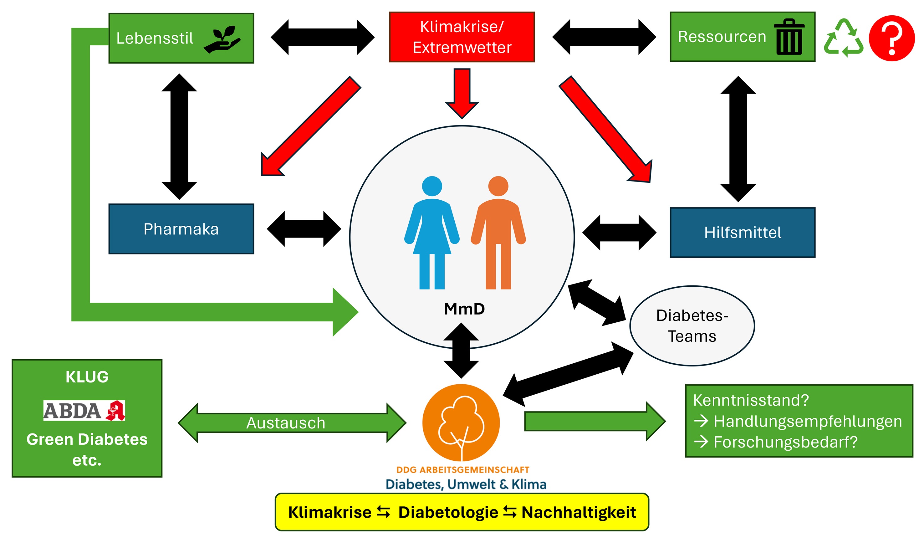 Die Arbeitsgemeinschaft Diabetes, Umwelt & Klima (AG DUK) ist die jüngste AG der Deutschen Diabetes Gesellschaft (DDG). Sie beschäftigt sich mit der reziproken Beziehung zwischen Menschen mit Diabetes und der Umwelt sowie Möglichkeiten der Ressourcenoptimierung im Rahmen des Diabetesmanagements. Umweltfaktoren nehmen wesentlich Einfluss auf uns Menschen. Eine stetig wachsende Datenbasis beschreibt die Einflüsse der klimatischen Veränderungen, Luftverschmutzung, Lärm und Extremwetterereignissen wie Hitze, aber auch Kälte auf die menschliche Gesundheit. Insbesondere Menschen mit chronischen Erkrankungen, so auch mit Diabetes mellitus, stellen eine besonders vulnerable Gruppe dar. Obgleich Diabetes-Teams und Menschen mit Diabetes aus Erfahrung wissen, dass beispielsweise Hitze einen relevanten Einfluss auf das Diabetesmanagement nimmt, gibt es erstaunlicherweise bisher nur wenige Daten zu dieser Thematik. Dementsprechend gibt es keine evidenzbasierten, systematischen Handlungsempfehlungen für den Umgang mit diesen Herausforderungen für Menschen mit Diabetes und ihre Diabetes-Teams.