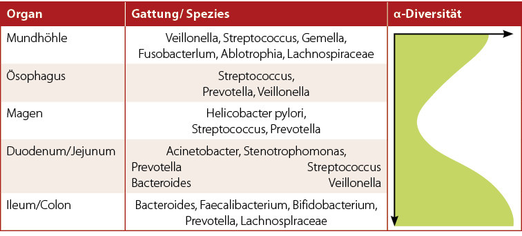 Die bakterielle Vielfalt des intestinalen Mikrobioms steigt in den ersten 5 Lebensjahren steil an und flacht danach bis zum 12. Lebensjahr zunehmend ab. Im Erwachsenenalter ist die bakterielle Diversität des intestinalen Mikrobioms relativ stabil, um ab dem 50. Lebensjahr wieder sukzessive bis ins hohe Alter abzunehmen.