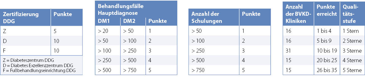 Der BVKD hält eine überprüfte Strukturqualität seiner Diabeteskliniken für sehr wichtig. Die umfassendsten Prüfungen erfolgen im Rahmen der Zertifizierung zum Diabetologikum DDG. Wenn beispielsweise das vom Verband entwickelte QMKD-Verfahren genutzt wird, kommen diabeteserfahrene Fachexperten des BVKD zusammen mit Auditoren der Zertifizierungsgesellschaften in die Kliniken und überprüfen die Ausstattung und Abläufe der Diabetesabteilungen. Deshalb erhalten so zertifizierte Einrichtungen eine hohe Punktzahl in der Transparenzliste. Für die stationäre bettenführende Diabetologie bildet die Behandlung diabetischer Folgeerkrankungen einen besonderen Schwerpunkt. Das typische Krankheitsbild ist hier das Diabetische Fußsyndrom. In Deutschland wurde von der AG Fuß der DDG ein Zertifizierungssystem für Fußbehandlungseinrichtungen etabliert, das ebenfalls in die Bewertung unserer Mitgliedshäuser eingeht. Diabeteskliniken mit der höchstmöglichen Strukturqualität erhalten die meisten Punkte in der BVKD-Transparenzliste.