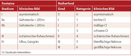 - Apparative Untersuchung: Dazu zählen Gefäßdoppler mit Berechnung des ABI (Knöchel-Arm-Index) (siehe Tab. 2), farbkodierte Duplexsonografie mit Pulskurvenanalyse, Pulsoszillografie der Digitalarterien (DPO) bzw. Licht-Reflexions-Rheografie (LRR) und transkutane Sauerstoffdruckmessung (tcPO2).
