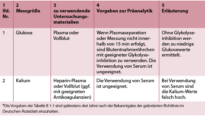 Seit Mai 2023 ist in den Richtlinien der Bundesärztekammer (Rili-BÄK) die Verwendung von Plasma-Probenröhrchen für die Glukosemessung aufgeführt (siehe Tabelle B1-1); außerdem muss, wenn die Glukosemessung nicht innerhalb von 15 Minuten nach der Blutentnahme erfolgt, innerhalb dieses Zeitraums das Plasma von den Blutzellen getrennt oder es müssen Röhrchen mit adäquaten Glykolysehemmern verwendet werden [Bundesärztekammer 2023]. Zu diesen Änderungen gehört auch die Verwendung geeigneter Probenröhrchen für Kaliummessungen.
